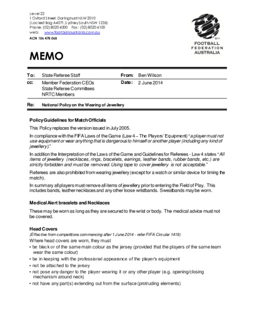Name National Policy on the Wearing of Jewellery 2014 Document File Document 20140602 Memo re National Policy on the Wearing of Jewellery_1rpcuc5avn5ei1qejxwhn47lxp.pdf