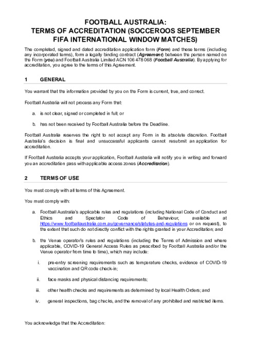 Name 250723 - Football Australia - Terms of Accreditation - Socceroos FIFA International Window - Canberra Official Date Friday, July 25, 2025 - 11:15 Document File Document 250723 - Football Australia - Terms of Accreditation - Socceroos FIFA International Window - Canberra.pdf