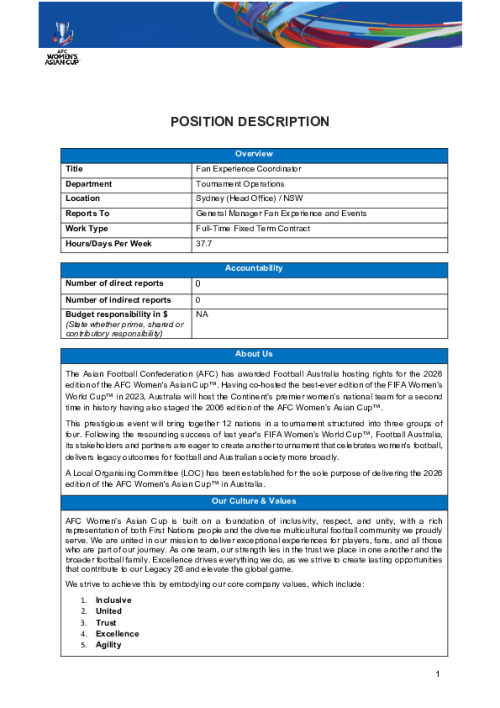 Name Position Description Fan Experience Coordinator 4/07/2025 Official Date Saturday, July 5, 2025 - 15:54 Document File Document Position description_ Fan Experience Coordinator.pdf