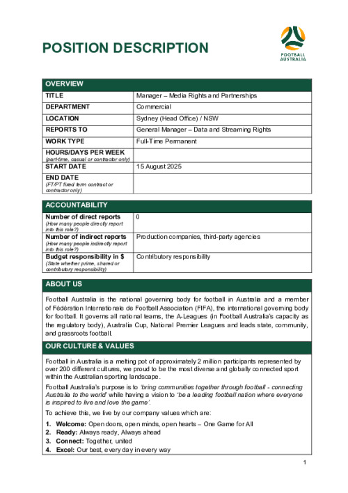 Name Position Description | Manager - Media Rights and Partnerships Official Date Thursday, July 17, 2025 - 10:15 Document File Document Position Description - Manager - Media Rights & Partnerships 07 2025.pdf