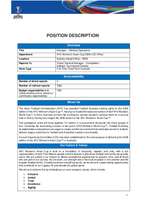 Name Position Description - Manager Medical Operations - AFC Women's Asian Cup 26 LOC Office Official Date Wednesday, January 22, 2025 - 17:37 Document File Document Position Description - Manager Medical Operations - AFC Women's Asian Cup 26 LOC Office.pdf