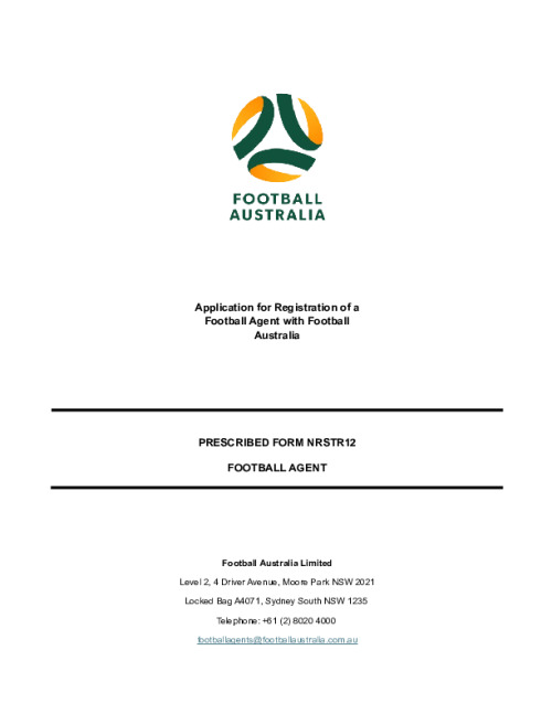 Name Prescribed Form NRSTR12 – Application for Registration of a Football Agent with Football Australia Official Date Thursday, August 14, 2025 - 11:00 Document File Document NRSTR Prescribed Form 12 (fillable form).pdf