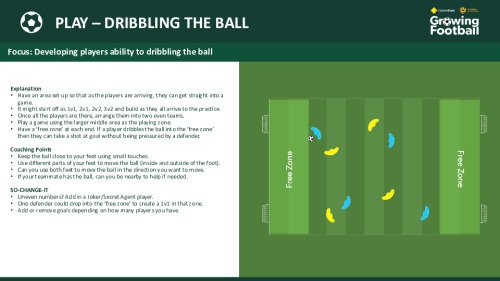 Name Session 11: Dribbling the Ball Developing a players ability when dribbling the ball. Official Date Thursday, July 31, 2025 - 16:30 Document File Document Session Plan 11- Dribbling the Ball.pdf