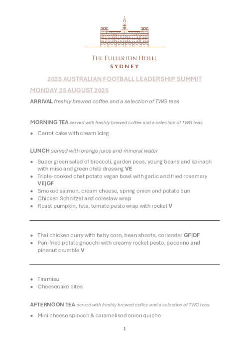 Name Summit Menu - 2025 Australian Football Leadership Summit - 25&26 August 2025 Official Date Tuesday, July 22, 2025 - 14:00 Document File Document Summit Menu - 2025 Australian Football Leadership Summit - 25&26 August 2025 .pdf